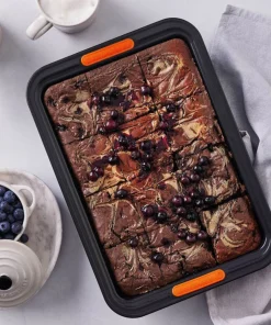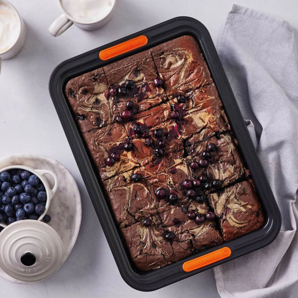 Ideal para elevar o nível das suas receitas de confeitaria, a Forma Retangular da linha Metal Bakeware Le Creuset é fabricada em aço carbono de grande calibre, material que garante uma condução de calor superior e uniforme para resultados perfeitos. Seu design leve e durável conta com um inovador revestimento antiaderente livre de PFOA, que assegura uma limpeza prática e rápida, além de abas largas com alças de silicone resistentes ao calor, proporcionando total segurança e conforto na transferência do forno para a bancada.